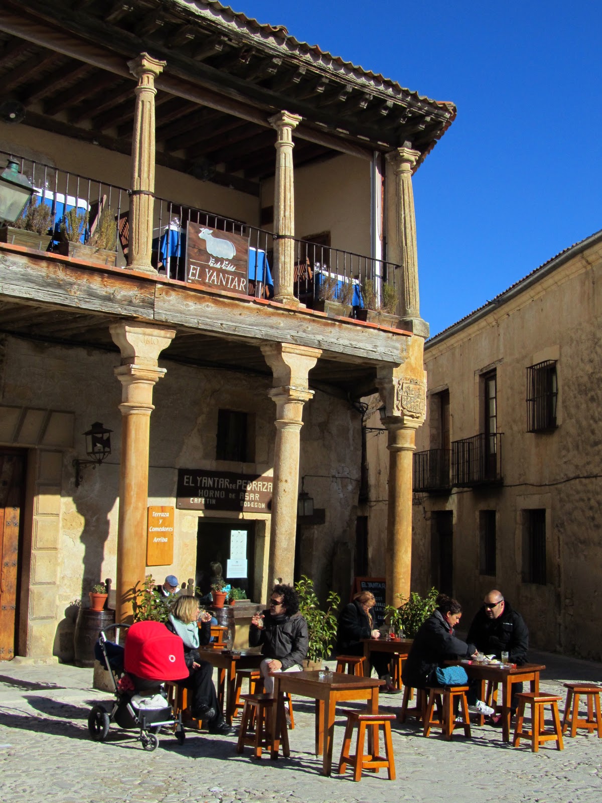 Después del paseo por el pueblo, donde luego veréis que goza de unas vistas preciosas del valle que lo rodea, decidimos disfrutar de la gastronomía del lugar, muy famosa por sus asados de cordero, lechal o cochinillo. Primero nos tomamos un rico aperitivo en La Taberna de Mariano, un sitio único, muy antiguo y con un gran encanto, situado en la Plaza Mayor, donde nos supo a gloria, el vino y las cañas que nos pedimos, acompañadas de media ración de chorizo ibérico. Después, nos dirijimos a comer a un restaurante asador muy conocido en Pedraza, localizado también en la Plaza Mayor, llamado El Yantar de Pedraza. Como éramos cuatro personas, compartimos, una ración de deliciosas croquetas de jamón, otra exquisita ración de cecina con almendras, unas patatas revolconas y 1/4 del famoso asado de lechal. Estaba todo riquísimo y calidad precio fenomenal. El café lo reservamos para Sepúlveda.